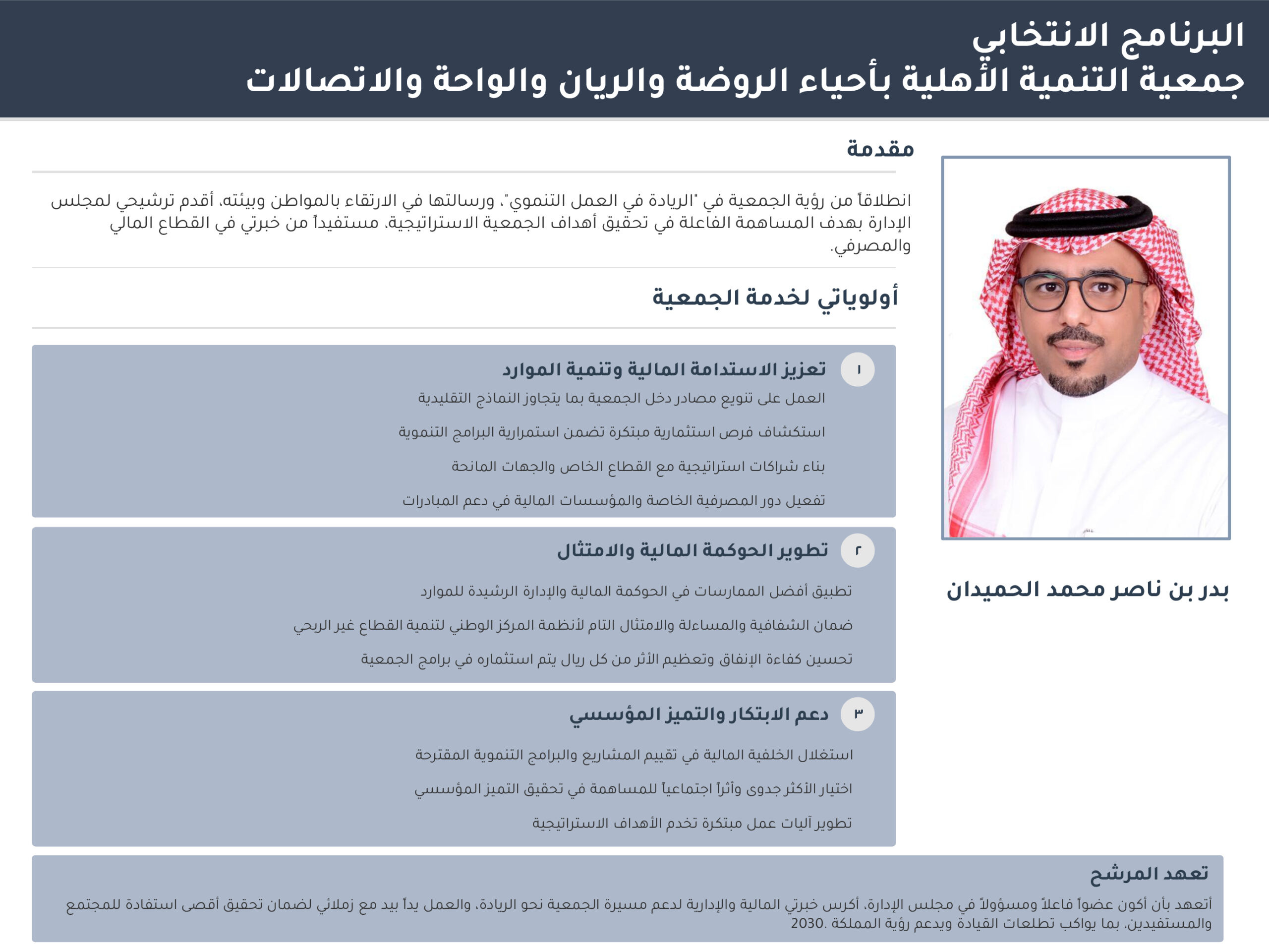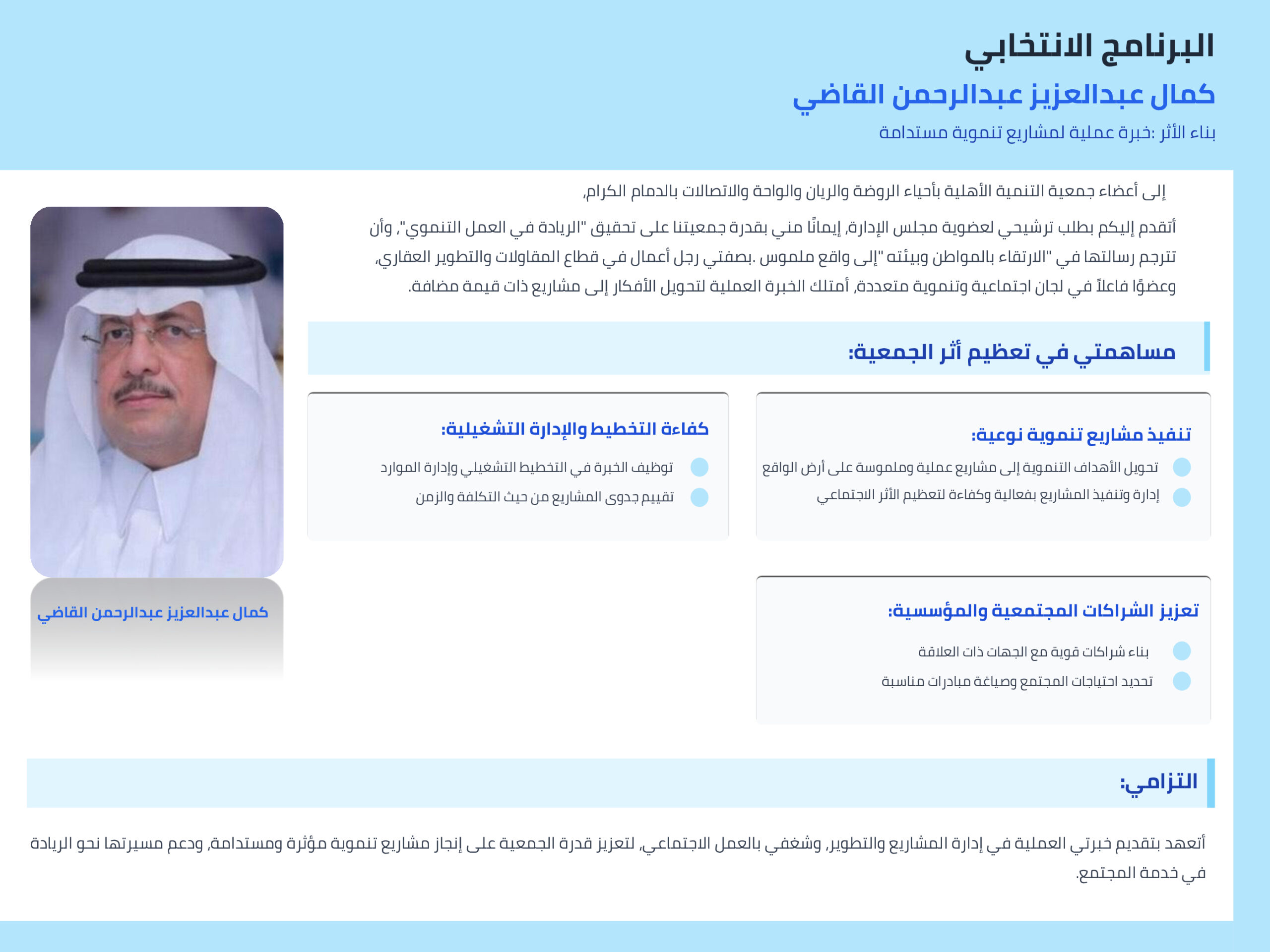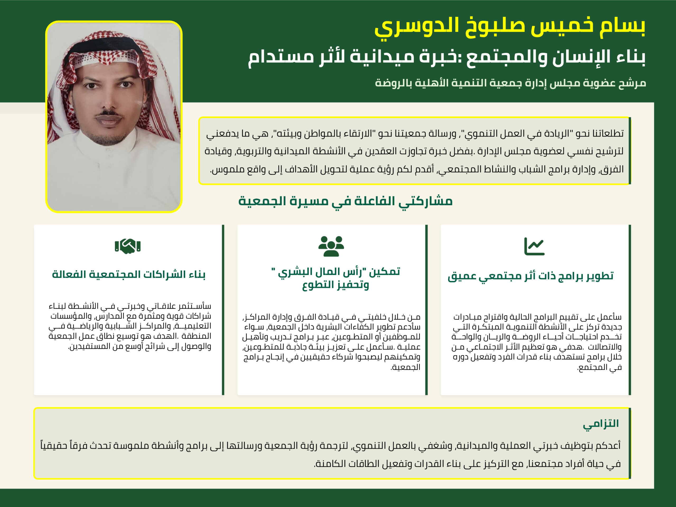 أعلنت جمعية التنمية الأهلية بالروضة عن ترشيح مجموعة من أعضائها لعضوية مجلس الإدارة، في خطوة تهدف إلى تعزيز مشاركة الأعضاء في صنع القرار وتطوير مسيرة الجمعية نحو مزيد من التميز والاستدامة.