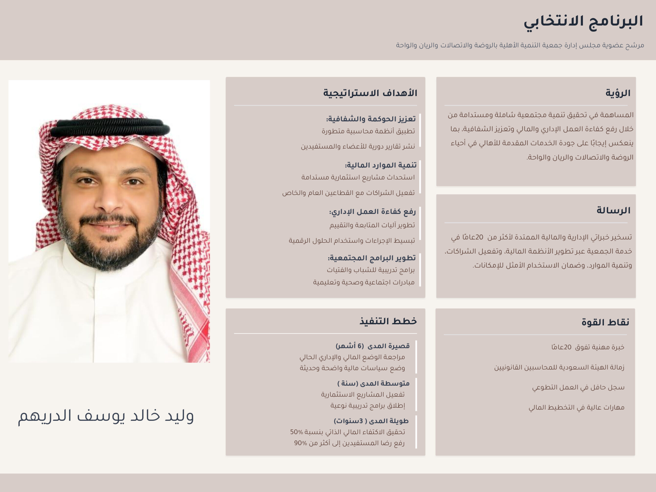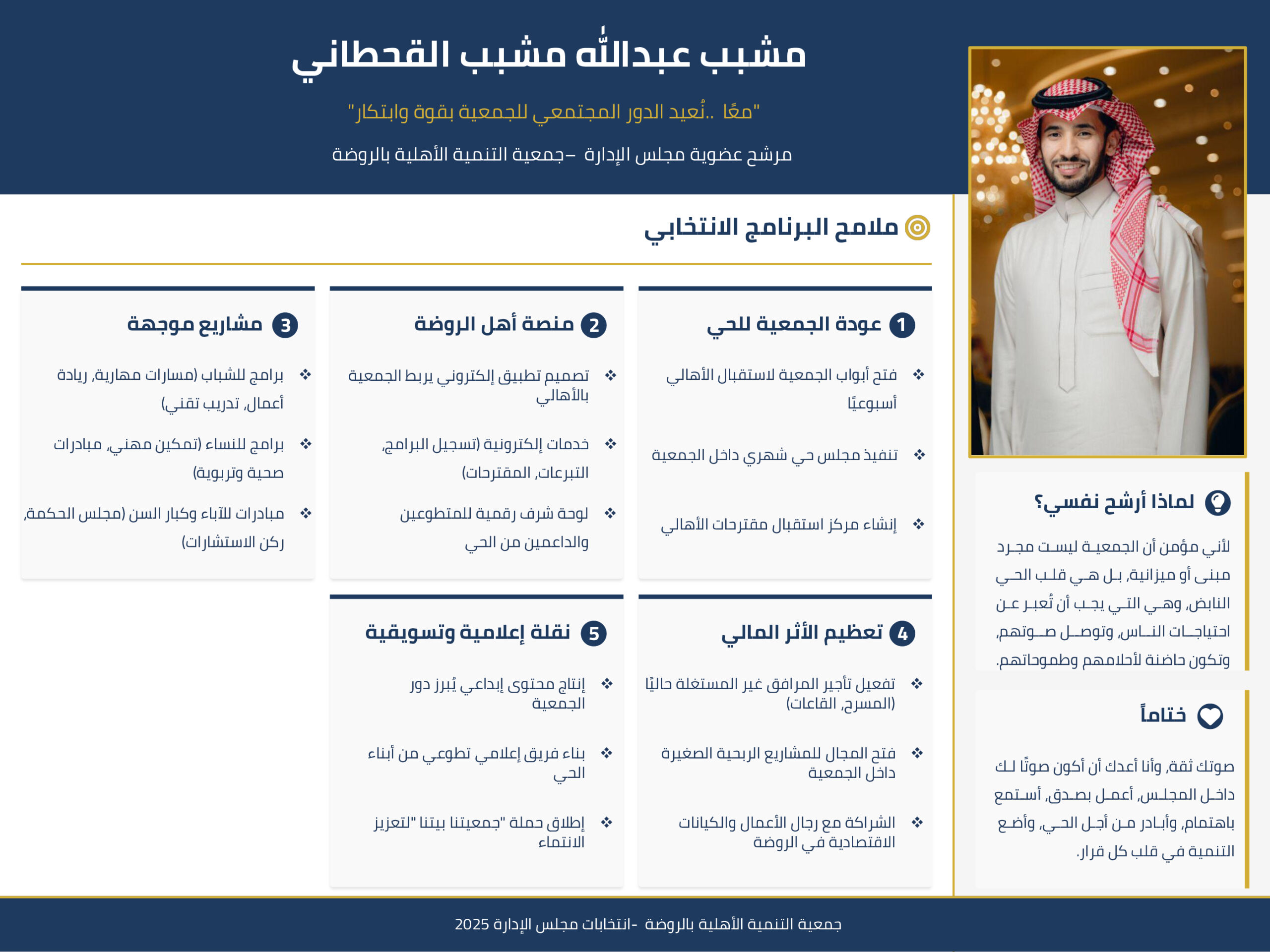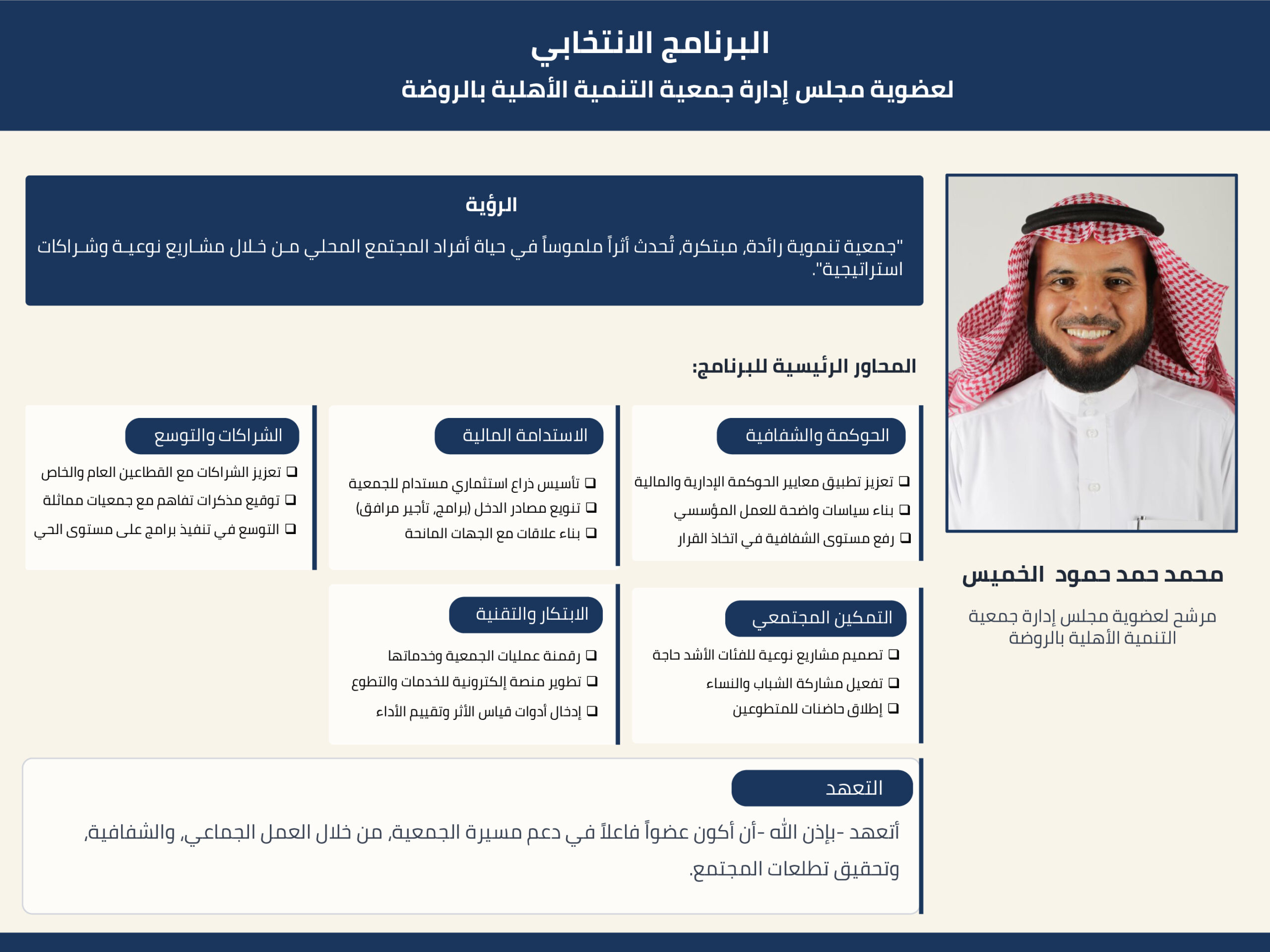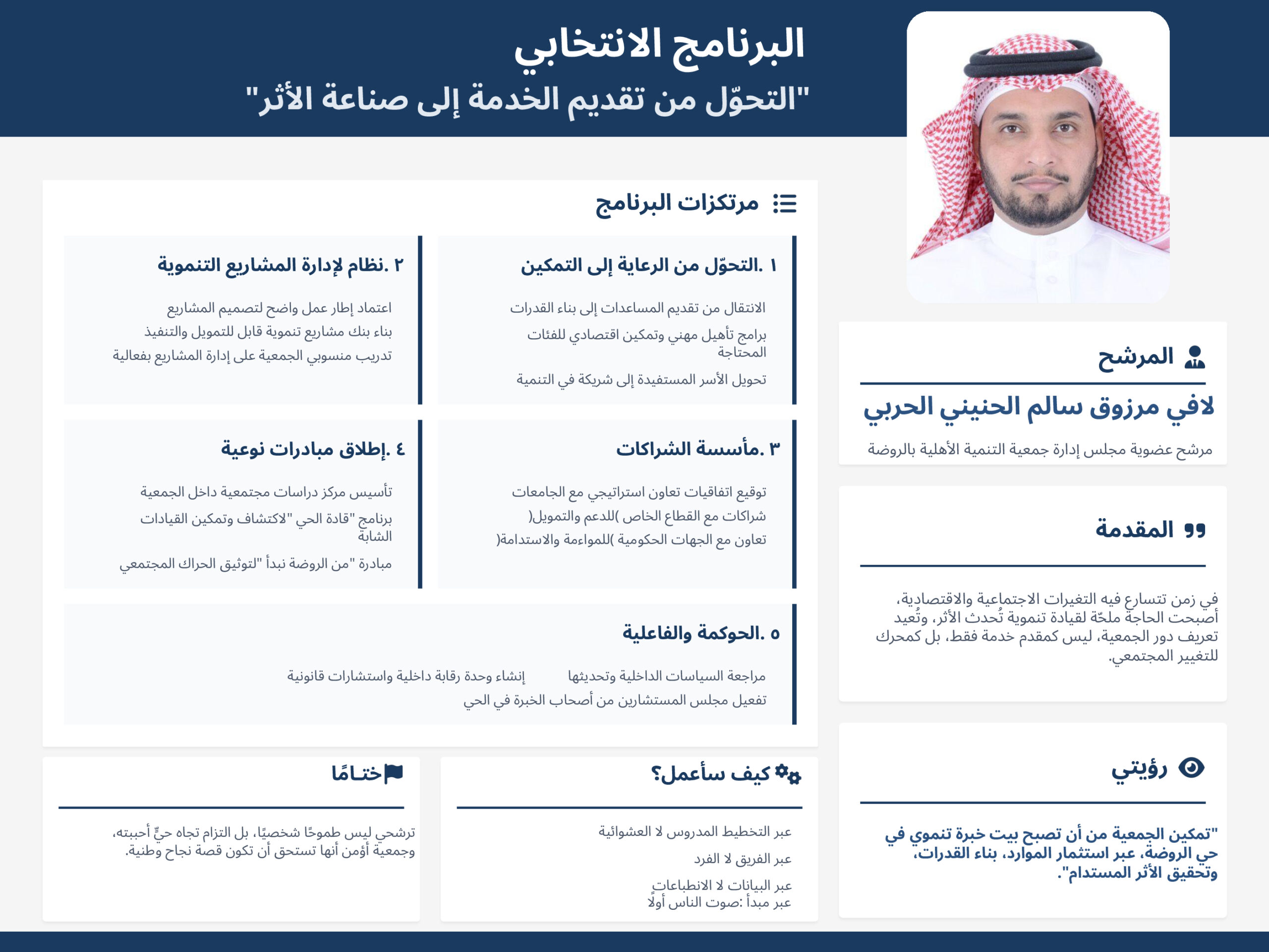 أعلنت جمعية التنمية الأهلية بالروضة عن ترشيح مجموعة من أعضائها لعضوية مجلس الإدارة، في خطوة تهدف إلى تعزيز مشاركة الأعضاء في صنع القرار وتطوير مسيرة الجمعية نحو مزيد من التميز والاستدامة.