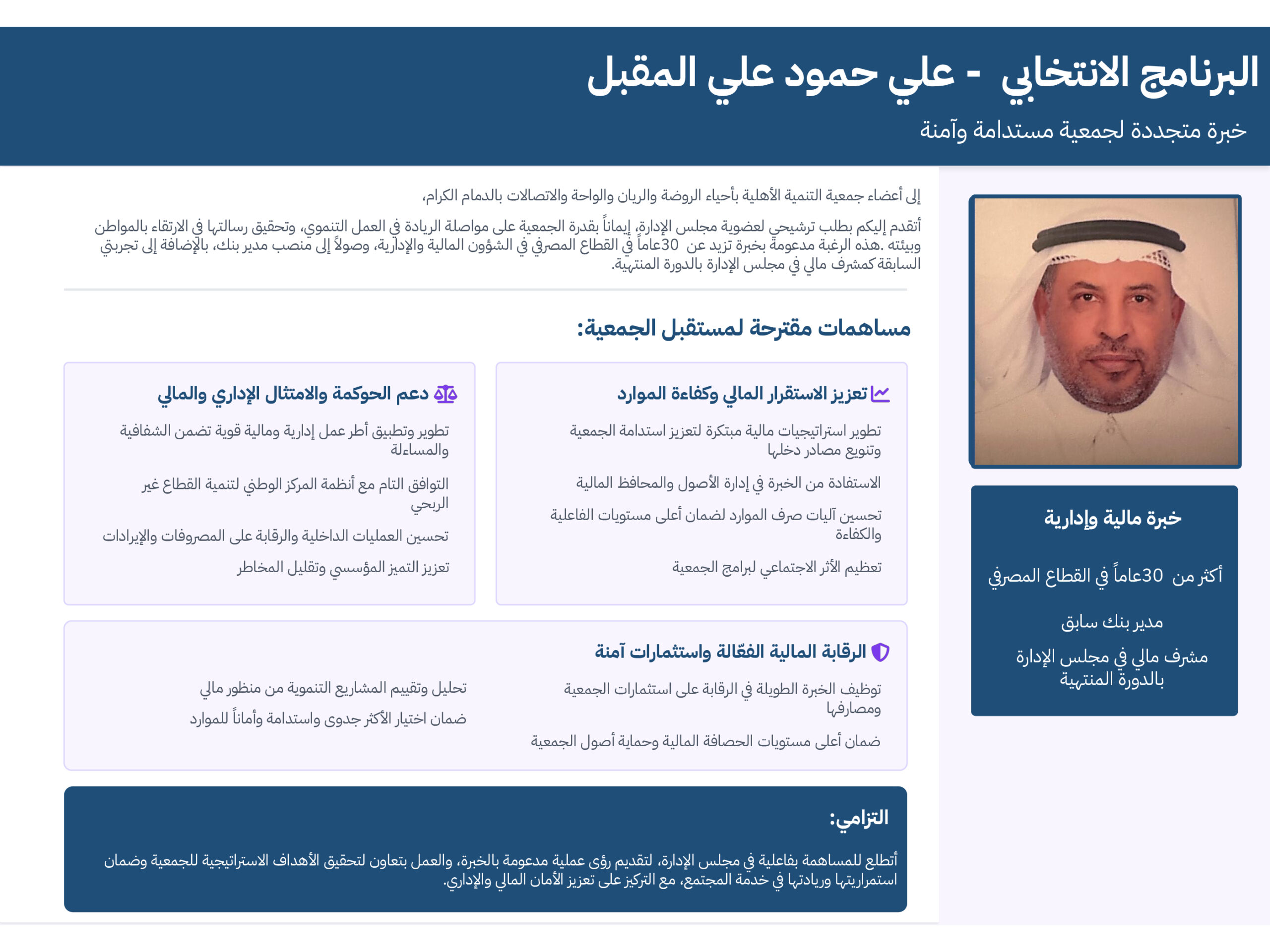 وأكدت الجمعية أن هذه البرامج الانتخابية تمثل خارطة طريق مستقبلية لتطوير أعمالها، وأنها تعكس حرص الأعضاء المرشحين على تقديم حلول عملية ومبادرات نوعية تسهم في خدمة المستفيدين وتحقيق أثر تنموي واسع.